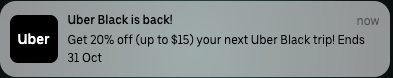 APPROACH: Executed a targeted relaunch campaign leveraging promotional incentives and strategic channel placement to maximise visibility. Focused on high-intent and high-value customer segments, while aligning messaging to reinforce the premium positioning of Uber Black versus other ride options.