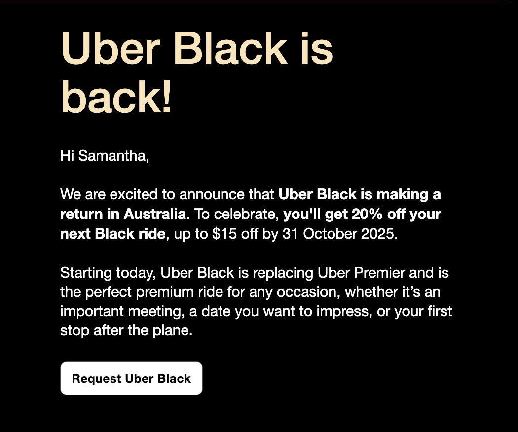 CONTEXT: Uber Black was reintroduced as a premium offering following its prior positioning as “Premier” in Australia. There was a need to re-establish brand recognition, educate users on updates to Uber Black vehicle standards, and drive renewed demand among high-value riders.