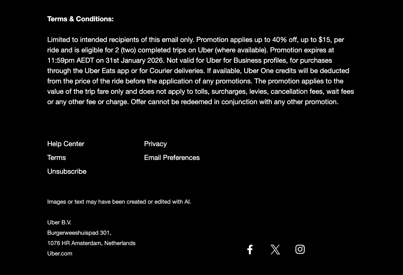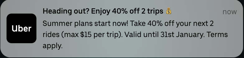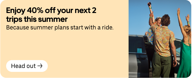 APPROACH: Executed a targeted lifecycle campaign offering 40% off the next two rides to lower the barrier to re-entry and encourage repeat usage. Messaging was anchored in summer travel moments, positioning Uber as a convenient way to get around, making the shift back to rides feel timely and relevant. Uber Eats in-app surfaces were leveraged to meet users where they were already active, significantly increasing visibility of the campaign and effectively encouraging cross-app usage.